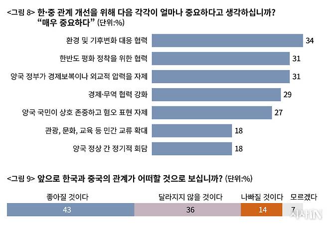 마지막으로 한·중 관계 개선을 위해 무엇이 중요한지 물었다(〈그림 8〉). “매우 중요하다”라는 응답 기준으로 ‘환경 및 기후변화 대응 협력’(34%), ‘한반도 평화 정착을 위한 협력’(31%), ‘양국 정부가 경제보복이나 외교적 압력을 자제’(31%) 순이었다. 앞으로 한·중 관계에 대한 전망도 물었다(〈그림 9〉). 좋아질 것이라는 응답이 43%로 가장 많았다. 달라지지 않을 것이라는 응답은 36%, 나빠질 것이라는 응답은 14%에 불과했다.