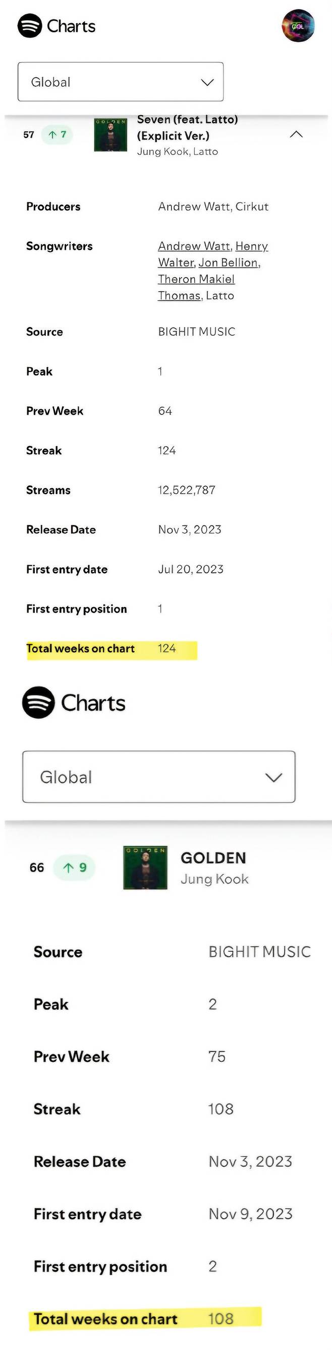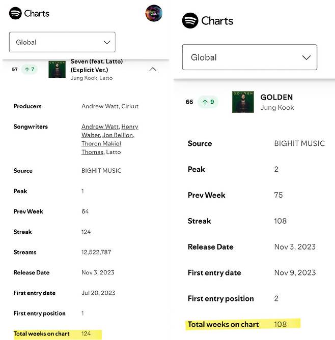 정국의 첫 솔로 앨범 ‘GOLDEN(골든)’ 역시 같은 기간 스포티파이 ‘위클리 톱 앨범 글로벌’ 차트에서 전주보다 9계단 오른 66위에 올랐다. 앨범 또한 아시아 솔로 가수 음반 중 유일하게 108주 동안 차트에 남아 있는 기록을 이어가고 있다.