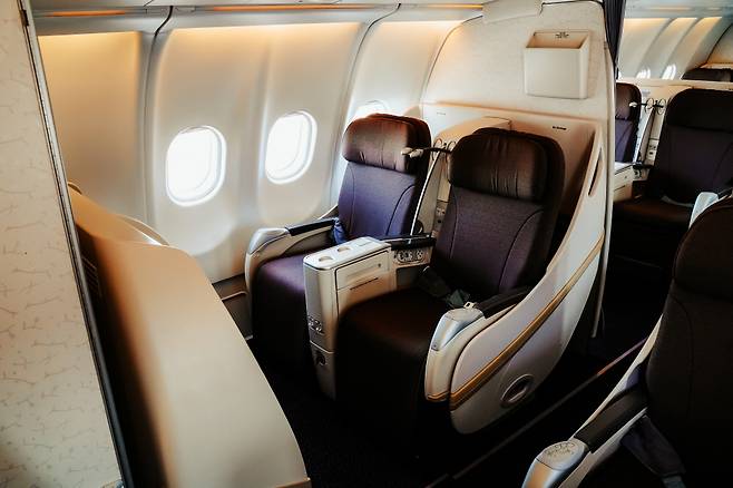 탑승 기종은 대형기 A330-200. 총 246석(비즈니스 18석, 이코노미 228석) 규모로, 장거리 비행에 최적화된 기재다. 특히 비즈니스석은 180° 완전 평면으로 펼쳐지는 침대형 좌석이고, 조명과 전원 콘센트도 갖췄다. 헤드레스트와 레그룸도 원터치 버튼을 이용해 조절할 수 있으니, 비행 중에도 '꿀잠 모드' 가능! 이코노미석 또한 최대 33인치(약 84cm)의 좌석 간격과 인체공학적 디자인으로 장시간 비행에서도 불편함이 없다.
