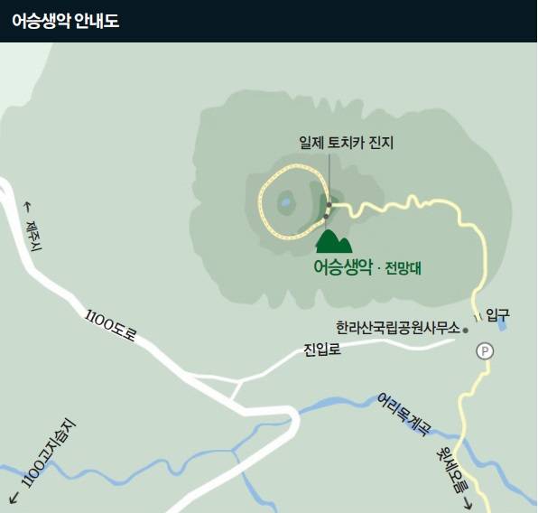 제주 오름 중 어승생악만큼 일제강점기의 생채기가 진하게 남은 곳도 드물다. 정상부엔 콘크리트를 퍼부어 만든 일제의 토치카 진지와 동굴 진지가 조성 당시의 모습 그대로 남았다. 이 가운데 개방된 내부 모습을 살펴보는 것도 어승생악을 오른 자의 특권이다.
