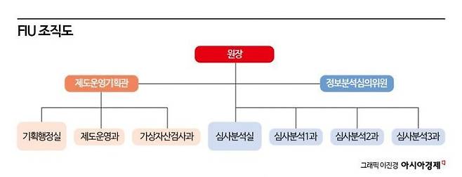 FIU는 조직도부터 남다르다. 크게 ▲기획행정실 ▲제도운영과 ▲가상자산검사과 ▲심사분석실로 구성된다. 직원은 약 70명이며, 이 중 금융위 소속 공무원은 30명 정도다. 나머지는 검찰·경찰·관세청·국세청에서 파견된 인력들이다.