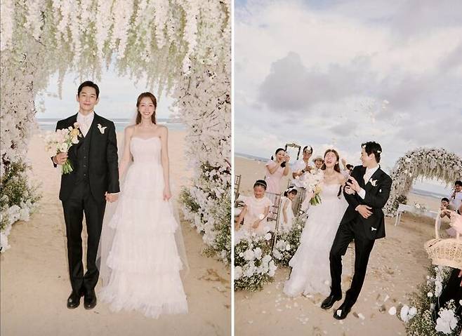 온주완♥방민아, 발리서 영화 같은 결혼식…하얀 꽃 아래 선남선녀