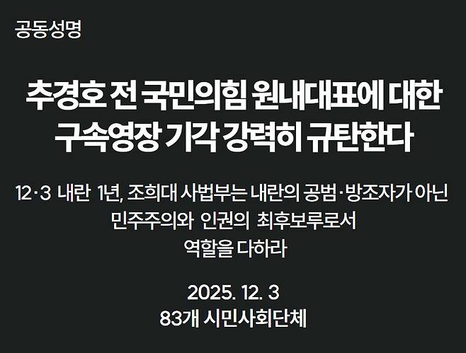 전국 83개 시민사회단체들은 3일 오후 긴급하게 공동 성명을 발표했다. 내란 사태 진상을 규명하고 책임자를 단죄해야 할 시대적 요구를 정면으로 거스르는 중대한 오판이고 내란 책임자들에게 면죄부를 주는 것이라는 주장이다.