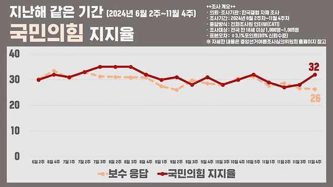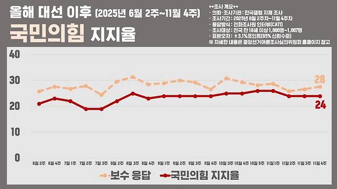 그런데, 주의 깊게 볼 대목이 있습니다. 위 표에서 점선이 보이실 텐데, 이건 자신의 정치 성향이 '보수'라고 답한 비율입니다. 즉, 자신이 보수라고 생각하는 비율보다 국민의힘 지지율이 밑돌고 있습니다.