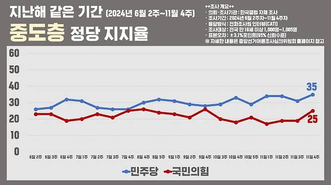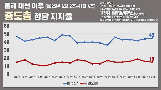 중도층 마음이 여전히 국민의힘에 돌아오고 있지 않다는 해석이 가능합니다.