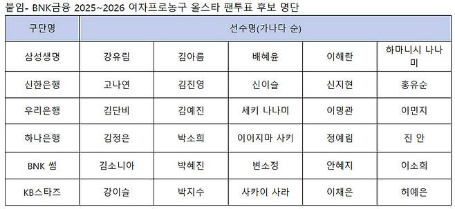 WKBL(한국여자농구연맹)은 오는 2026년 1월 3일~4일 양일간 부산 사직체육관에서 열리는 ‘BNK금융 2025~2026 여자프로농구 올스타 페스티벌’에 참가할 선수를 뽑는 팬 투표 후보 명단을 확정했다.