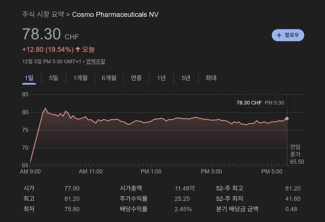 시장은 즉각 반응했다. 스위스 증시에 상장된 코스모파마슈티컬스 주가는 이날 78.3스위스프랑에 거래를 마치며 전거래일 대비 19.5% 급등했다. 2008년 이후 17년 만에 가장 큰 일일 상승 폭을 기록했다. 지오바니 디 나폴리 코스모파마슈티컬스 최고경영자(CEO)는 “남성형 탈모에 있어서 30여년 만에 처음 등장한 잠재적인 혁신”이라고 강조했다.