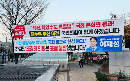 이번 현수막이 더 큰 관심을 끄는 이유는, 조경태 의원의 해양수도 특별법 표결 불참 때문이다. 지난달 본회의에서 재석 256명 중 255명이 찬성해 사실상 만장일치로 통과된 법안이었지만, 정작 조 의원은 표결에 참여하지 않았다. 그럼에도 조 의원은 지역 곳곳에 '특별법 통과'를 자축하는 현수막을 내걸어 논란을 키웠다.
