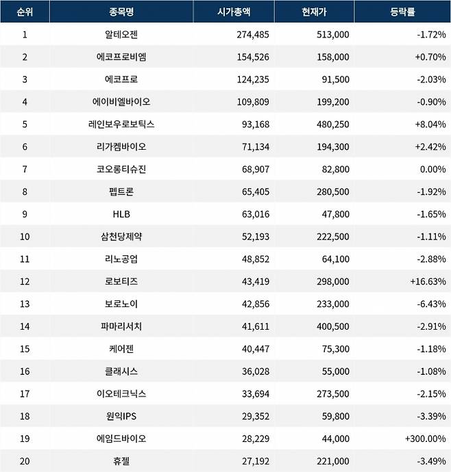 시가총액 상위 종목들은 등락률에서 서로 다른 모습을 보이며, 특히 에임드바이오는 300%의 급등을 기록해 주목받고 있다.