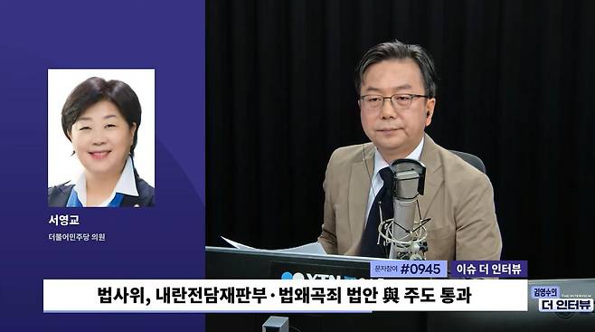 ◆ 김영수 : 라디오 <김영수의 더인터뷰> 1부 이슈 인터뷰 문을 열어주실 분 법사위 위원이시죠? 더불어민주당 서영교 의원입니다. 19대부터 22대까지 서울 중랑갑에서 내리 4선을 한 국회의원입니다. 여러 이슈 물어보겠습니다. 의원님 나와 계시죠?