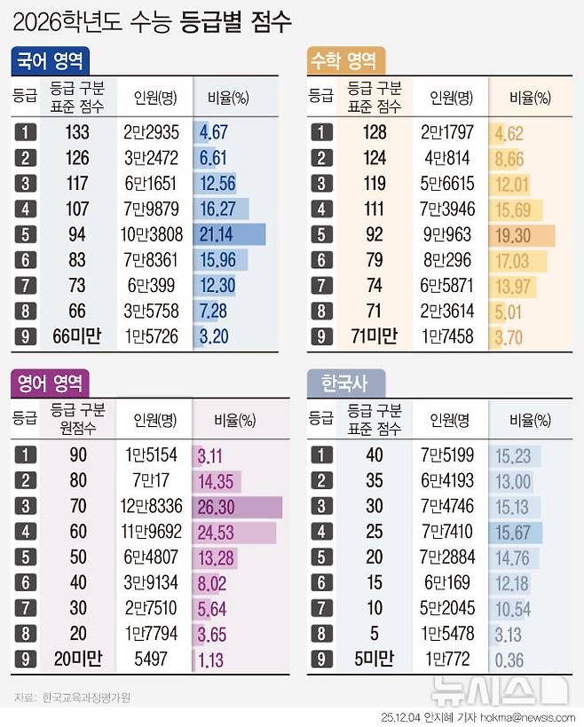 [서울=뉴시스] 한국교육과정평가원에 따르면 2026학년도 수능 채점 결과 난이도가 전년 대비 전반적으로 상승한 것으로 나타났다. 난이도가 어려울수록 점수가 상승하는 표준점수 최고점은 국어 147점, 수학 139점이다. 국어는 전년 139점 대비 8점이 올랐고 수학은 전년 140점과 유사했다. 한편 학생들이 받는 성적통지표에는 영역 및 과목별 표준점수와 백분위, 등급이 표기된다. (그래픽=안지혜 기자)