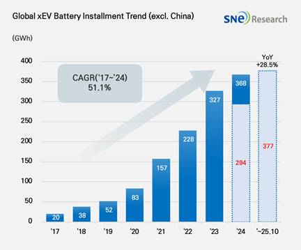 SNE리서치는 4일 발표한 자료에 따르면, 올해 1~10월 중국을 제외한 글로벌 전기차(EV·PHEV·HEV) 배터리 사용량이 377.5GWh로 집계됐다고 밝혔다. 전년 대비 28.5% 증가한 수치다.