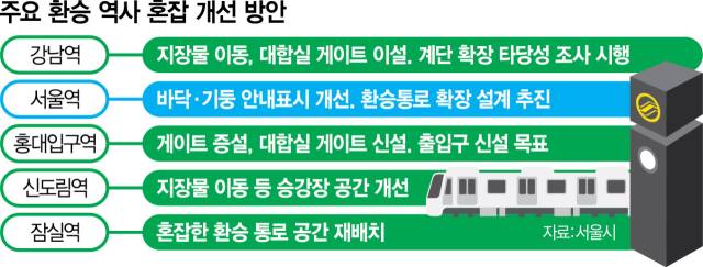구체적으로 홍대입구역은 대기공간 통로 쪽 게이트로 하차 승객이 몰리는 만큼 기존 게이트를 늘리고 대기공간에 게이트를 신설해 이용객 분산을 유도할 계획이다. 서울역은 5개 노선이 지나면서 환승 거리가 길고 복잡하므로 바닥과 기둥 등에 안내 표시를 개선하는 작업을 벌인다. 강남역과 신도림역은 공간이 좁은 원인이 되는 지장물을 철거하고 잠실역은 혼잡한 환승 통로 공간을 재배치한다.