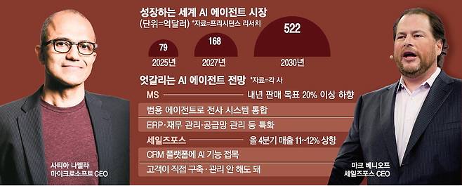 범용 AI 에이전트를 판매하는 MS는 기업의 AI 도입 속도가 예상보다 느려 매출 목표를 낮췄지만, 버티컬 AI 에이전트를 내세운 세일즈포스는 제품군의 고성장에 힘입어 실적 전망을 상향 조정했다.