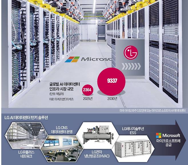 LG그룹은 인공지능(AI) 시대 ‘뜨는 시장’인 글로벌 AI 데이터센터 인프라 시장을 잡기 위해 LG전자, LG에너지솔루션, LG유플러스, LG CNS 등을 한 팀으로 묶은 ‘원(One) LG’ 체제를 가동했다. 2030년 9337억달러(약 1373조원) 규모로 커질 이 시장을 효율적으로 공략하기 위해선 힘을 합쳐야 한다고 판단했기 때문이다. 올 하반기 들어 성과가 본격화하고 있다. 냉난방공조(HVAC·LG전자)와 에너지저장장치(ESS·LG에너지솔루션), 데이터센터 운영(LG CNS) 등 분야별 실력자들이 하나로 묶이면서 고객사의 요구에 빠르고 정확하게 대응하는 ‘원스톱 서비스’를 구현하게 돼서다. LG는 마이크로소프트(MS)를 시작으로 AI 데이터센터 사업을 벌이는 다른 빅테크로 고객 확장에 나설 계획이다.