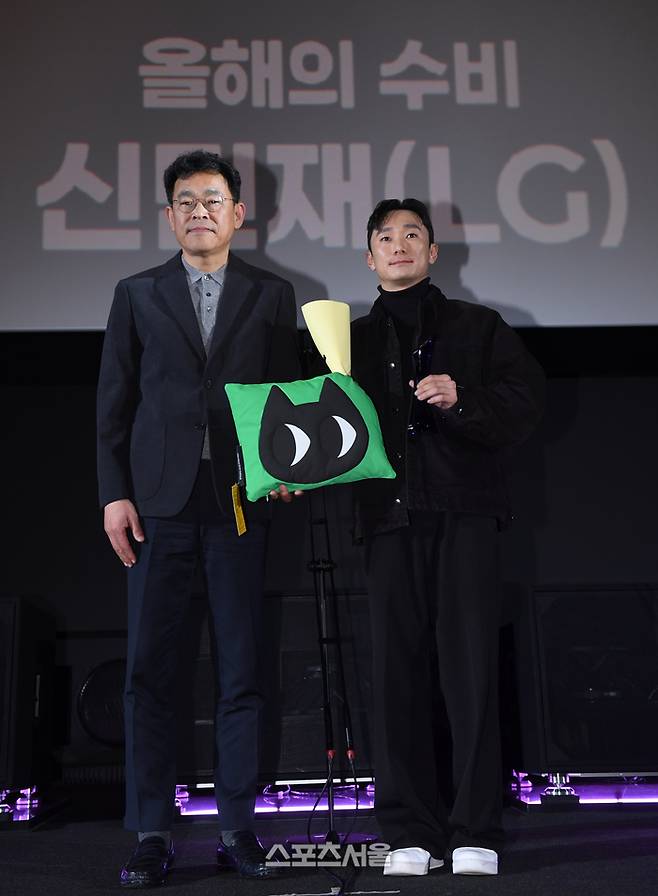 LG 신민재(오른쪽)가 4일 서울 영등포구 타임스퀘어 CGV 영등포 스크린X관에서 열린 '제39회 스포츠서울 올해의 상'에서 올해의 수비상을 수상한 뒤 시상자인 밀알출판사 최검열 대표와 기념촬영을 하고 있다.