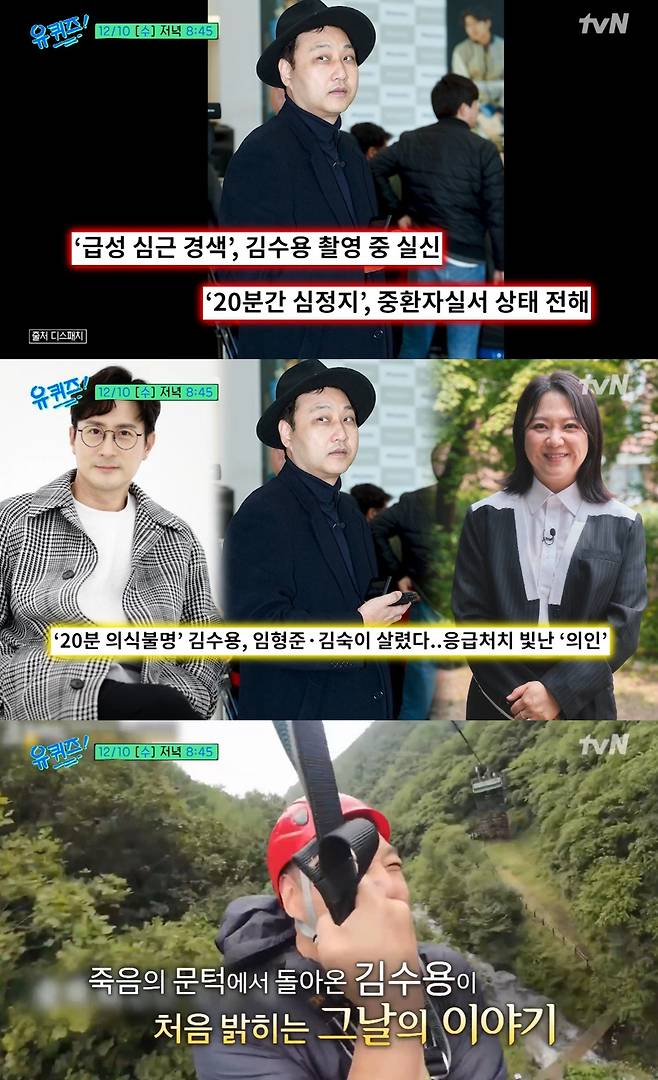 '유퀴즈' 측은 의식불명이던 김수용을 살린 임형준과 김숙의 화면을 함께 띄웠고, "죽음의 문턱에서 돌아온 김수용이 처음 밝히는 그날의 이야기"라는 예고로 눈길을 끌었다.