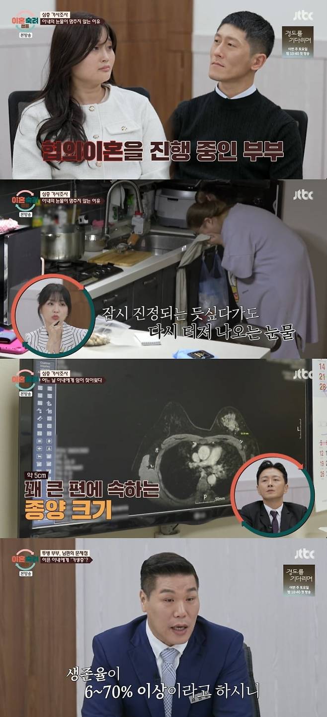 이날 방송에서 '투병부부' 아내는 남편과 우연히 술자리에서 만났다며 "말을 너무 예쁘게 해서 끌렸다"고 밝혔다. 하지만 두 사람은 "더 이상 못 살겠다"며 협의 이혼 중이라고.