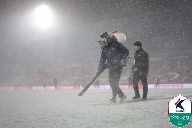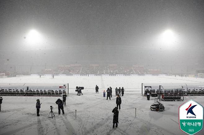 초유의 사태가 발생했다. 4일 부천종합운동장에서 열릴 예정이었던 부천FC와 수원FC의 '하나은행 K리그 2025' 승강 플레이오프 1차전이 폭설로 전격, 취소됐다. 경기가 폭설로 취소된 것은 K리그 전산망이 갖춰진 이래 처음이다. 2018년 11월24일 상주종합운동장에서 펼쳐진 당시 상주 상무와 강원FC의 경기가 눈 때문에 킥오프가 2시간 연기된 적은 있다. 눈이 아닌 태풍과 안개, 천둥 등의 이유로 취소된 케이스는 6번 있었다.