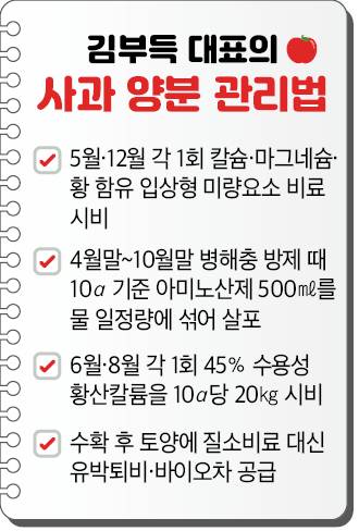 김 대표는 과단성도 있다. 질소질 비료는 쓰지 않고 유박퇴비와 가축분 바이오차로 대체하는 게 대표적이다. 그는 “991㎡당 유박퇴비 4포대(75㎏)와 바이오차 1포대(20㎏)를 시비하는데, 질소를 과하게 쓰면 당도가 낮아지고 사과 품질이 떨어질 수 있어 지난해부터 바이오차를 추가했더니 지력 향상 효과가 컸다”고 귀띔했다.