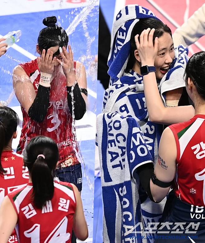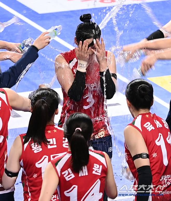 [화성=스포츠조선 허상욱 기자] 서브로만 4득점을 기록하며 팀 승리에 힘을 보탠 IBK기업은행 박은서가 동료들의 시원한 물세례를 받으며 기쁨을 만끽했다.
