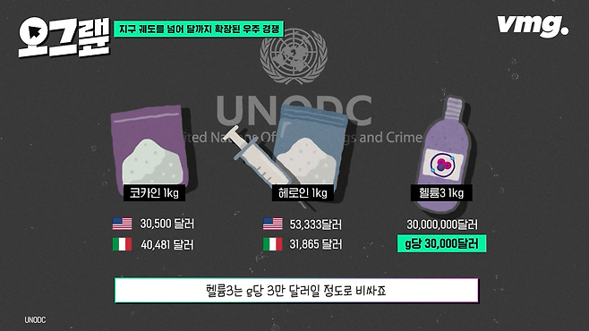 UN에서 집계하고 있는 주요 지역별 마약 시세입니다. 미국에서 코카인이 kg당 3만 달러인데, 헬륨3는 g당 3만 달러일 정도로 비쌉니다.