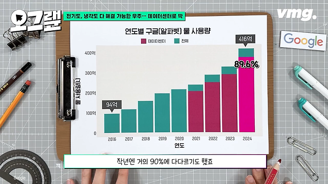 2016년, 구글의 물 사용량은 94억 리터. 작년엔 그 규모가 416억 리터로 늘어납니다. 8년 사이에 4배 이상 증가한 겁니다. 2021년부터는 구글의 데이터센터에서 사용한 물만 따로 볼 수 있는데 그 비율 역시 점점 늘어나고 있습니다. 작년엔 거의 90%에 다다르기도 했어요.