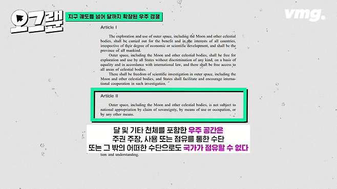 1967년 발효된 '우주 조약'이라는 게 있습니다. 이 조약에는 달을 비롯해서 우주를 탐색할 때 국가의 활동을 규율하는 원칙이 담겨 있죠. 여기에는 이런 조항이 있습니다. "우주 공간은 국가가 점유할 수 없다" 당연히 달도 마찬가지입니다. 달도 특정 국가가 점령하거나 소유할 수는 없어요.