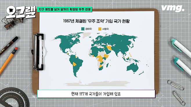 미국과 영국, 당시 소련이 주도해서 만든 1967년의 우주조약입니다. 현재 117개 국가들이 가입해 있죠.