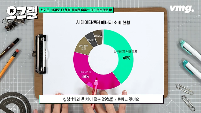 AI 데이터센터에 들어가는 에너지를 그려보면 1위는 컴퓨팅 및 서버 운영입니다. 전체 에너지의 40%를 차지하고 있죠. 2위가 바로 냉각 시스템인데 실상 1위랑 큰 차이 없는 39%를 기록하고 있어요.