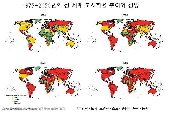 유엔의 새 기준에 따르면 한국은 도시 76%, 소도시 14.4%로 도시지역이 90.4%에 이른다. 나머지 9.6%는 농촌이다. 국가데이터처가 발표한 2025년 도시화율 92.1%와 큰 차이가 없는 수치다. 한국은 행정구역상 읍급 이상 지역을 도시로 보고 도시화율을 계산한다.