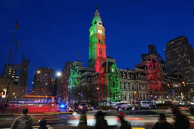 [필라델피아=AP/뉴시스] 4일(현지 시간) 미 펜실베이니아주 필라델피아의 시청 건물이 크리스마스 조명으로 물들어 있다. 2025.12.05.