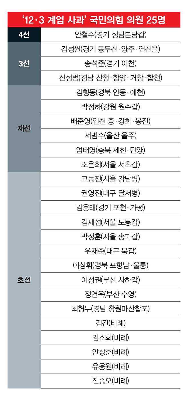 원내 기류도 심상찮다. 안철수·김용태·김재섭 의원과 우재준 최고위원을 비롯한 국민의힘 소장파 의원 25명은 '별동대'를 자처하며 12월3일 계엄에 대해 "윤 전 대통령을 비롯한 비상계엄을 주도한 세력과 정치적으로 단절할 것"이라고 밝힌 후 5초간 90도로 허리 숙여 대국민 사과에 나섰다. 여기에 SNS와 매체 인터뷰 등을 통해 별도의 사과 메시지를 내거나 지도부 차원 사과를 촉구한 권영세·조경태 의원 등을 포함하면, 당내 107명 중 40명에 달하는 의원이 계엄 사과에 동참하며 장 대표에게 반기를 든 셈이다.