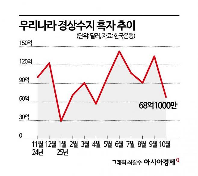 5일 한국은행이 발표한 '2025년 10월 국제수지(잠정)'에 따르면 지난 10월 우리나라 경상수지 흑자는 68억1000만달러를 기록했다. 2023년 5월 이후 30개월 연속 흑자로, 2000년대 들어 두 번째로 긴 흑자 흐름을 지속했다. 다만 흑자 규모는 지난해 같은 기간(94억달러)과 전월(134억7000만달러) 대비 모두 줄었다.