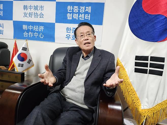 | ▲ 권기식 회장 인터뷰에 응하는 권기식 한중도시우호협회 회장 |