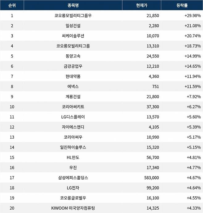 이어 상승률 2위 일성건설(013360)은 현재가 2,280원으로 주가가 21.08% 폭등하고 있다. 상승률 3위 씨케이솔루션(480370)은 현재 10,070원으로 20.74% 급등하며 강세를 보이고 있다. 상승률 4위 코오롱모빌리티그룹(450140)은 18.73% 상승하며 13,310원에 거래되고 있다. 상승률 5위 동양고속(084670)은 14.99%의 상승세를 타고 24,550원에 거래되고 있다.