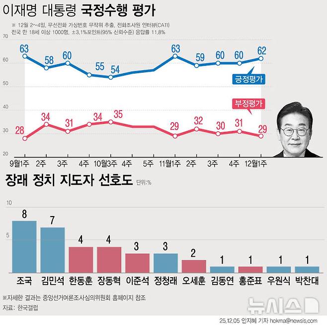 [그래픽] 이재명 대통령 지지율 62%…차기 지도차, 조국 8%·김민석 7%·한동훈 4%