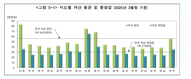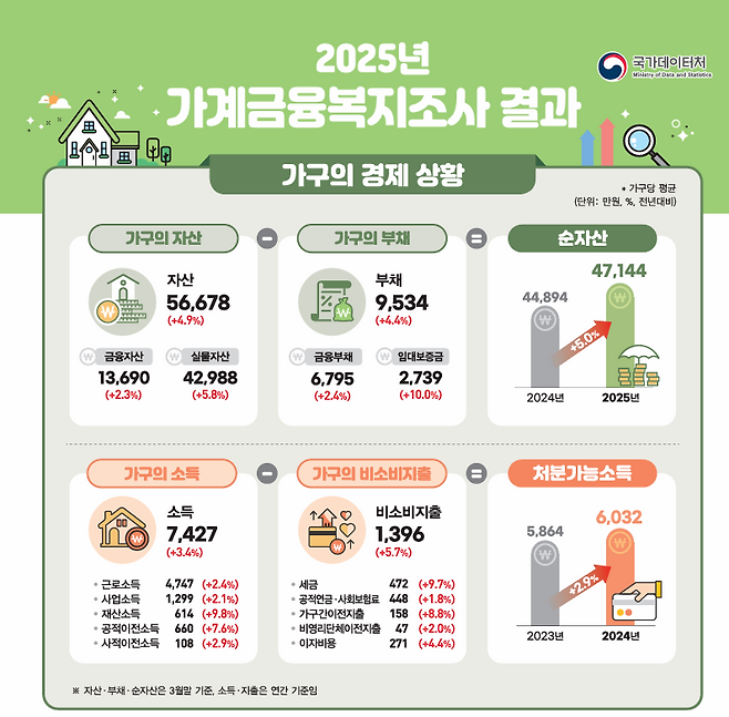 국가데이터처가 발표한 2025년 가계금융복지조사 결과를 보면 2025년 3월 말 기준 우리나라 전체 가구의 평균 자산은 전년 대비 4.9% 늘어난 5억 6,678만 원, 부채는 4.4% 증가한 9,534만 원으로 집계됐습니다.