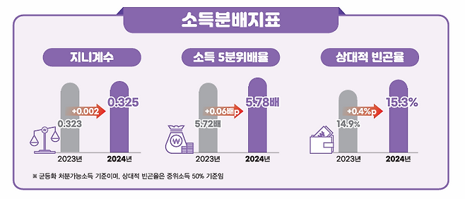 지니계수·5분위 배율·상대적 빈곤율 등 소득 불균등 지표 일제히 악화