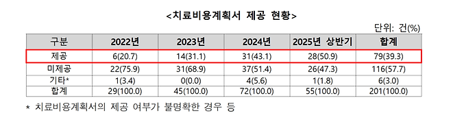 분쟁이 급증하는 가운데 ‘치료비용계획서’가 제공된 경우는 40%에 못 미쳤습니다.