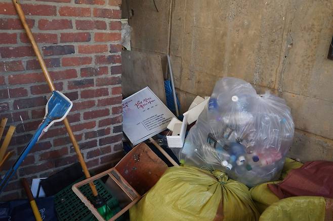 | ▲ A중학교 후관 뒤편 쓰레기장에서 발견된 윤석열 국정목표 액자. |