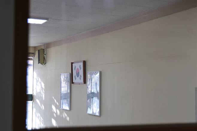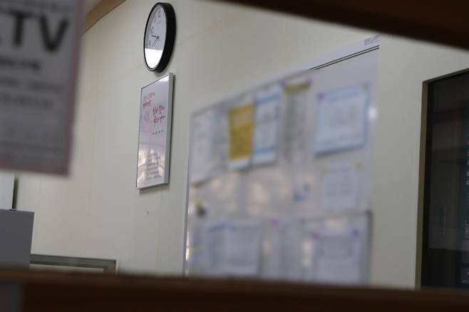 | ▲ A중학교 행정실 모습. 벽시계 아래 '함께 잘사는 국민의 나라' 액자가 걸려 있다. |