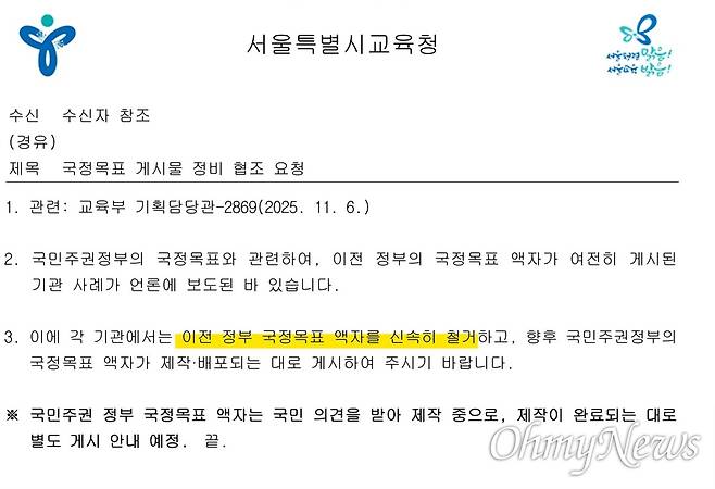 앞서 지난 11월초 서울시교육청은 관내 전체 학교에 "이전 정부 국정목표 액자를 신속히 철거하라"는 내용의 공문을 보냈다.
