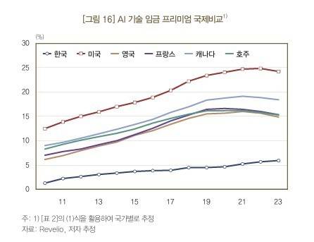 반면 우리나라의 AI 인력 처우는 낮은 수준에 머물러 있습니다. 미국은 25%에 육박하는 높은 임금 프리미엄을 AI 인력에게 지급하는 반면, 우리나라는 약 6%의 임금 프리미엄을 지급하고 있습니다. 캐나다(18%), 영국(15%), 프랑스(15%) 등 주요국과 비교해도 절반이 채 되지 않습니다.