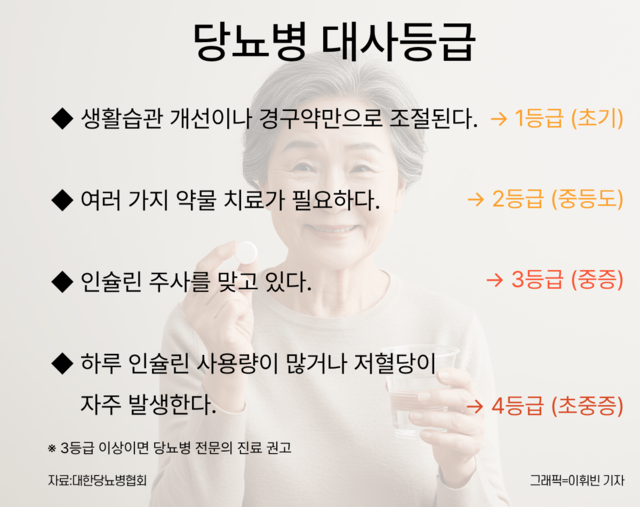 ▲1등급은 생활 습관 개선이나 경구약으로 조절 가능한 단계 ▲2등급은 여러가지 약물 치료가 필요한 단계 ▲3등급은 인슐린이 분비되지 않아 주사를 맞는 단계 ▲4등급은 인슐린 사용량이 많거나 저혈당이 자주 발생하는 단계다. 3등급 이상이면 당뇨병 전문의와 상담해야 한다.