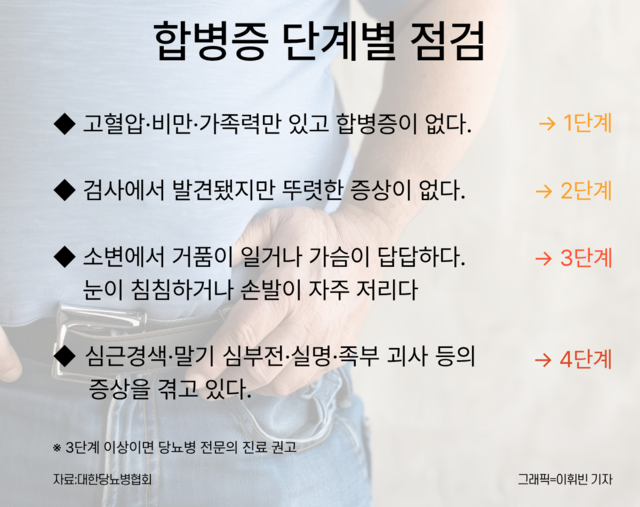 1기는 합병증은 없지만 고혈압, 비만 등 위험 요인이 있을 때 해당된다. 2기는 당뇨병 검사에서만 발견되는 초기 합병증 상태다. 3기는 협심증, 신장 기능 저하, 시력 이상 등 질환이 임상적으로 확인되는 단계다. 4기는 심근경색, 말기 신부전, 실명 등 생명을 위협하는 상태를 뜻한다.