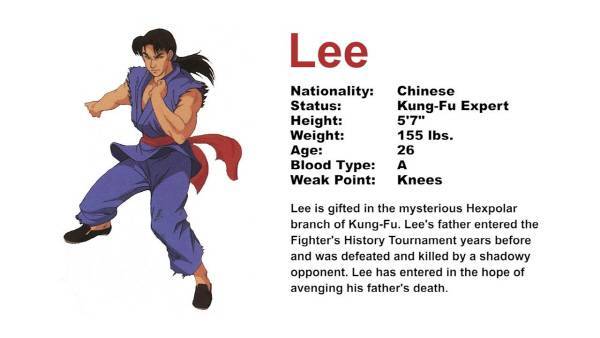 검떠: 월드 히어로즈에 완전 이소룡과 판박이인 캐릭터가 등장하죠. 아쵸오~ 호쾌한 공격이 일품입니다. 좌우 이동도 빠르고, 벽타기 형태의 점프 공격에 연속기도 강력해서 매번 대회때마다 강력한 우승후보로 꼽히는 캐릭터이기도 합니다.