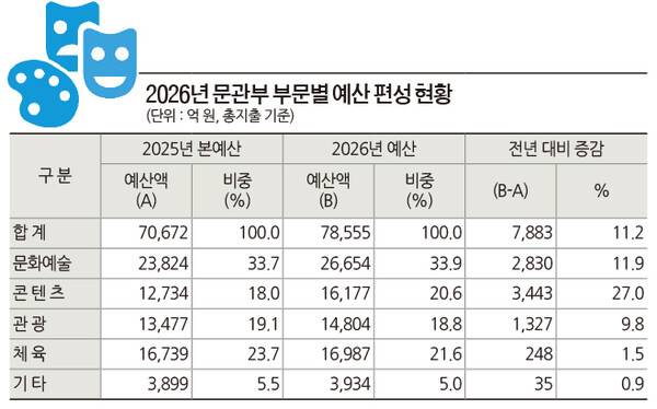 2026년 문관부 부문별 예산은 관광 1조4,804억원(2025년 본예산 대비 +9.8%) 문화·예술 2조6,654억원(+11.9%) 콘텐츠 1조5,177억원(+27%) 체육 1조6,987억원(+1.5%) 등으로 편성됐다. 예산 비중은 문화·예술이 33.9%로 가장 높았고, 체육 21.6%, 콘텐츠 20.6%, 관광 18.8%, 기타 5% 순으로 차지했다. 올해대비 문화·예술과 콘텐츠 부문 예산 비중은 늘고, 체육과 관광 비중은 소폭 감소했다.