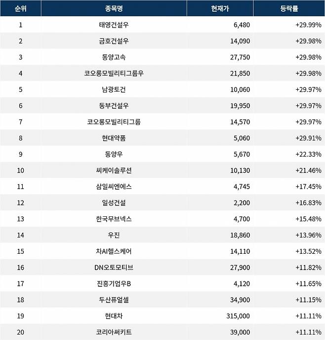 6위 동부건설우(005965)는 종가 19,950원으로 29.97% 급등 마감했다. 7위 코오롱모빌리티그룹(450140)은 종가 14,570원으로 29.97% 급등 마감했다. 8위 현대약품(004310)은 종가 5,060원으로 29.91% 급등 마감했다. 9위 동양우(001525)는 종가 5,670원으로 22.33% 급등 마감했다. 10위 씨케이솔루션(480370)은 종가 10,130원으로 21.46% 급등 마감했다.