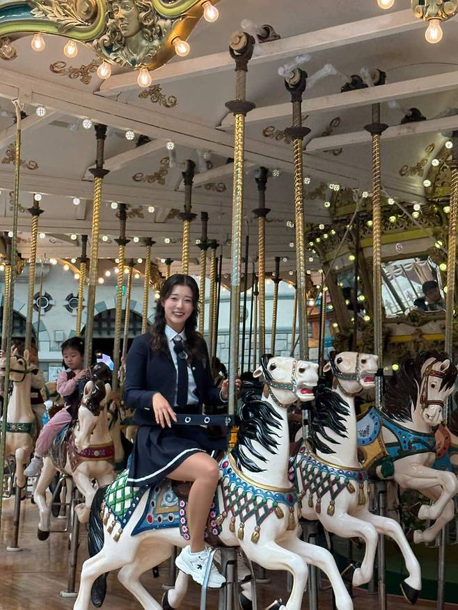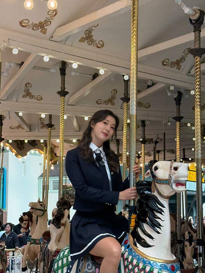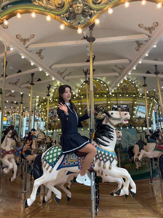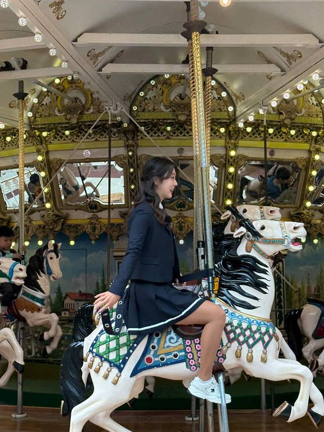 이어 회전목마 위에서 찍은 사진에서는 김재희가 밝은 미소와 귀여운 손짓으로 현장을 더 화사하게 만들었다.